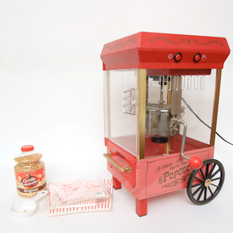 The old fashioned movie time popcorn maker. First find a stable place near an electrical outlet before starting. Makes popcorn just like the movies.