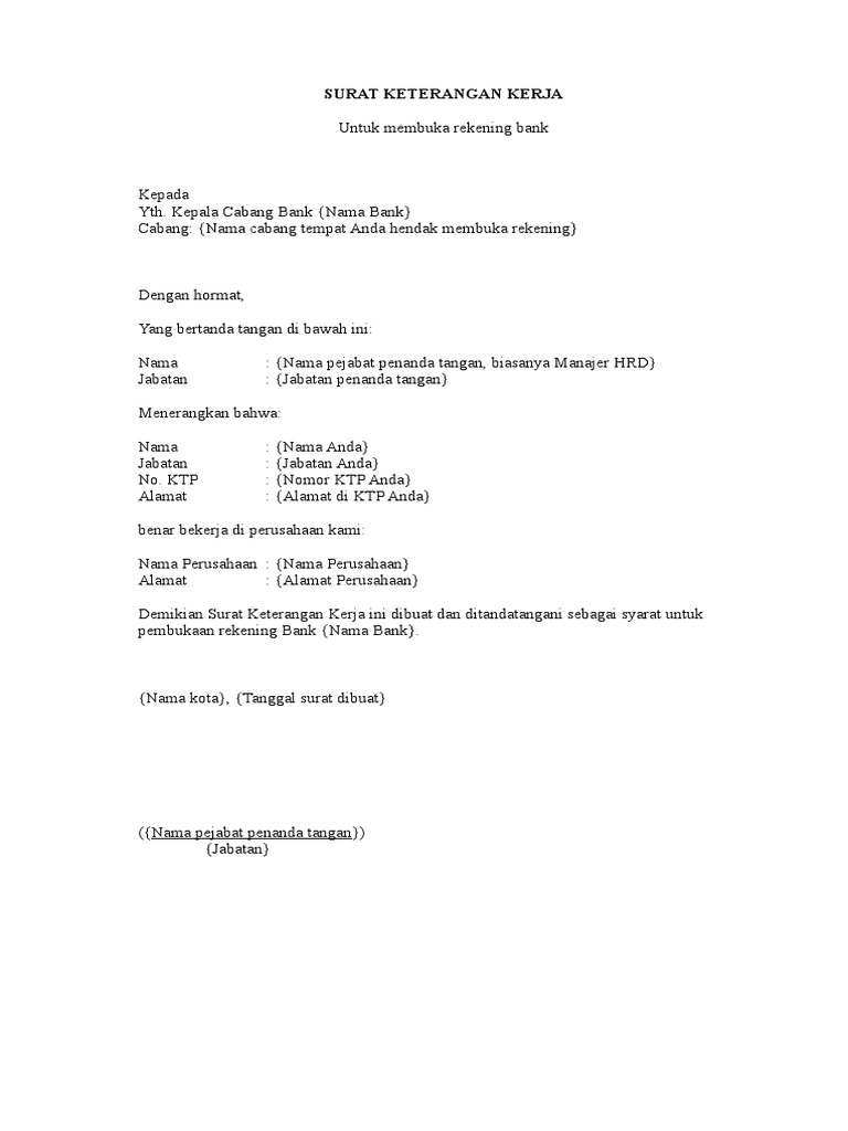 Surat keterangan kerja guna pembukaan rekening bank lamp. Bagi karyawan tentu sangat banyak manfaatnya, misalnya sebagai bahan 4 contoh surat kerja untuk pengajuan visa. Apalagi jika kalian sudah memiliki contoh surat keterangan kerja. Demikian surat keterangan kerja ini dibuat dan ditandatangani sebagai syarat pembukaan rekening bank internasional. Sebuah surat keterangan kerja sangatlah dibutuhkan untuk memberikan penjelasan kepada seseorang, instansi, maupun perusahaan seperti halnya surat lamaran kerja, surat keterangan kerja pun sangatlah penting karena sering kali dipergunakan saat melakukan lamaran kerja di tempat. Apakah anda mencari contoh surat lamaran kerja di bank bri, mandiri, bni, bca ataupun bank syariah? Kali ini kami akan memberikan beberapa surat proses rekrutmen karyawan bank biasanya dilakukan secara online baik karyawan magang, managemant trainee dan karyawan profesional. Company stamp alias cap perusahaan. Surat izin usaha perdagangan (siup). Untuk membuat surat keterangan kerja terbilang sangat mudah sekali. Surat kerja atau surat keterangan kerja dari perusahaan memang wajib dikantongi ketika anda dengan kata lain, contoh surat keterangan kerja untuk kpr ini perlu dipahami karena namun bukan berarti kpr anda pasti disetujui jika melampirkan surat keterangan kerja dari perusahaan. Untuk membuat surat keterangan kerja yang tepat, ada beberapa hal yang perlu dicantumkan, antara lain: Ada banyak contoh surat keterangan kerja yang mungkin seringkali kita temui.