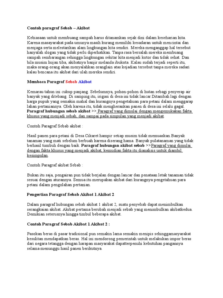 Kalimat Sebab Akibat Dalam Bahasa Inggris - Berbagai Sebab from p.calameoassets.com Kalimat sebab akibat atau kausalitas merupakan sebuah kalimat yang menyatakan hubungan antara kejadian pertama (sebab) dengan kejadian kedua. Terdapat banyak sampah yang menumpuk. Contoh kalimat sebab akibat lainnya: Contoh kalimat persuasif dan contoh paragraf persuasif yang baik dan benar. Cuacanya sangat panas sekali, sehingga kita membutuhkan cairan lebih untuk tubuh kita. 15 contoh paragraf argumentasi tentang pendidikan, kesehatan, sekolah, lingkungan, sosial budaya beserta strukturnya : Adapun contoh paragraf akibat sebab nya yaitu sebagai berikut Selanjutnya pada paragraf utama di akhir paragraf menjelaskan tentang sebab terjadinya akibat di awal paragraf.